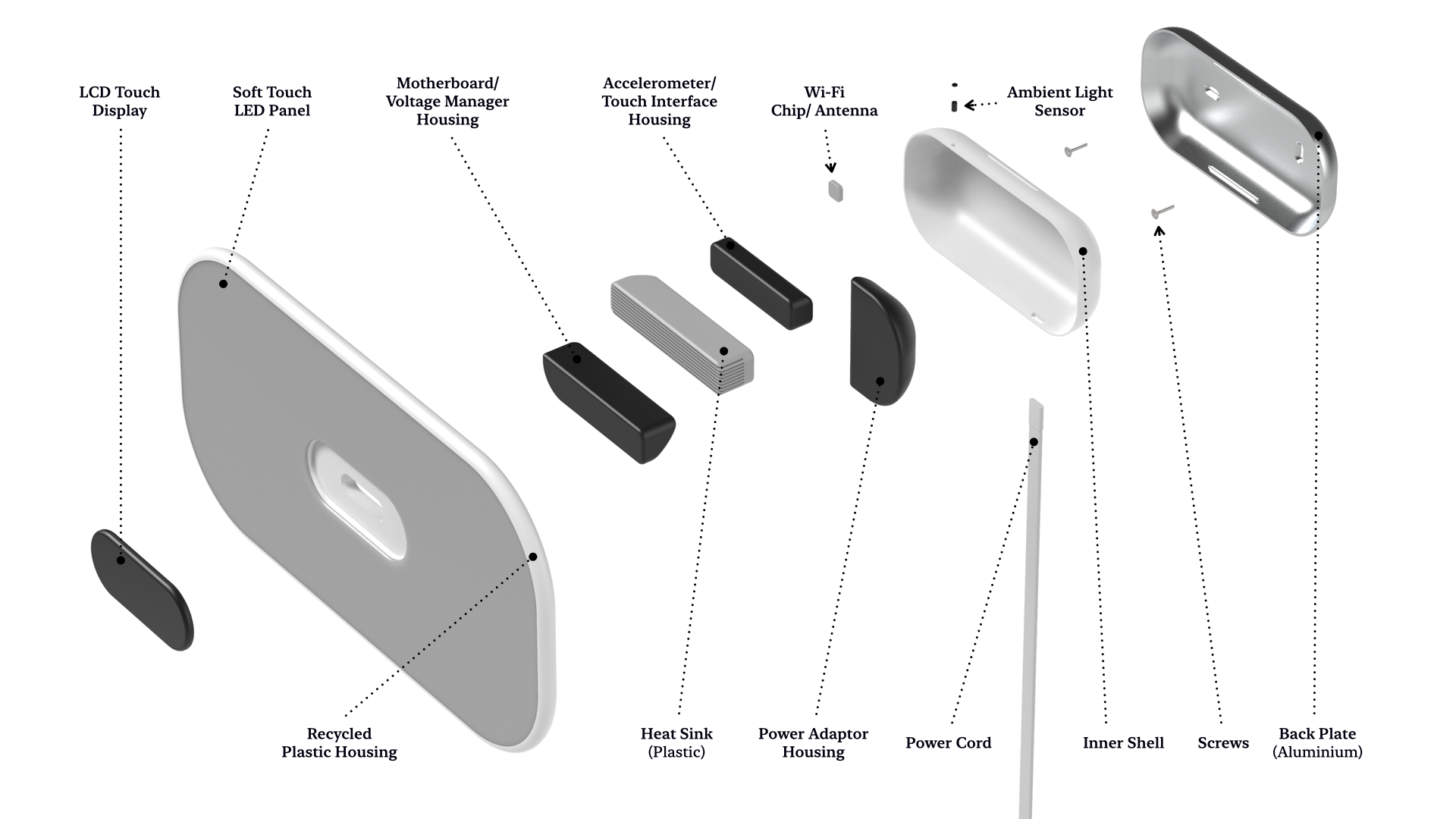 This design revision instead of having a touchscreen has a mirror, which informs the user when they should get more light time depending on their location. Furthermore, besides having a mirror that is multifunctional, the display shines through the mirror keeping everything minimal while showing the important details like sunrise, sunset, time, and date.